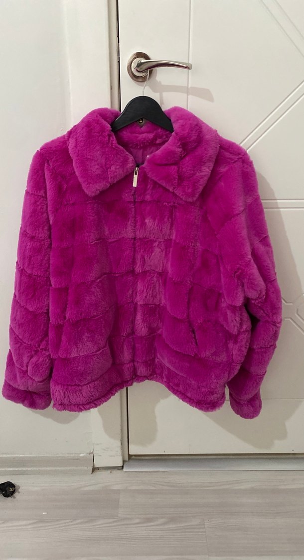 Pembe, parlak tie-dye desenli suni kürk ceket, notlu yaka ve uzun kollu. Rahat kesim, midi boy ve yumuşak fleece kumaşla konforlu. Bohem, retro tarzda günlük kullanım için uygun.
