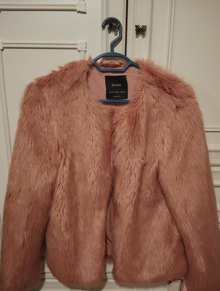 Pembe tonlarında, uzun kollu ve suni kürkten yapılmış, notched lapel yakalı, orta boy kadın ceket. Günlük kullanıma uygun rahat kesim.