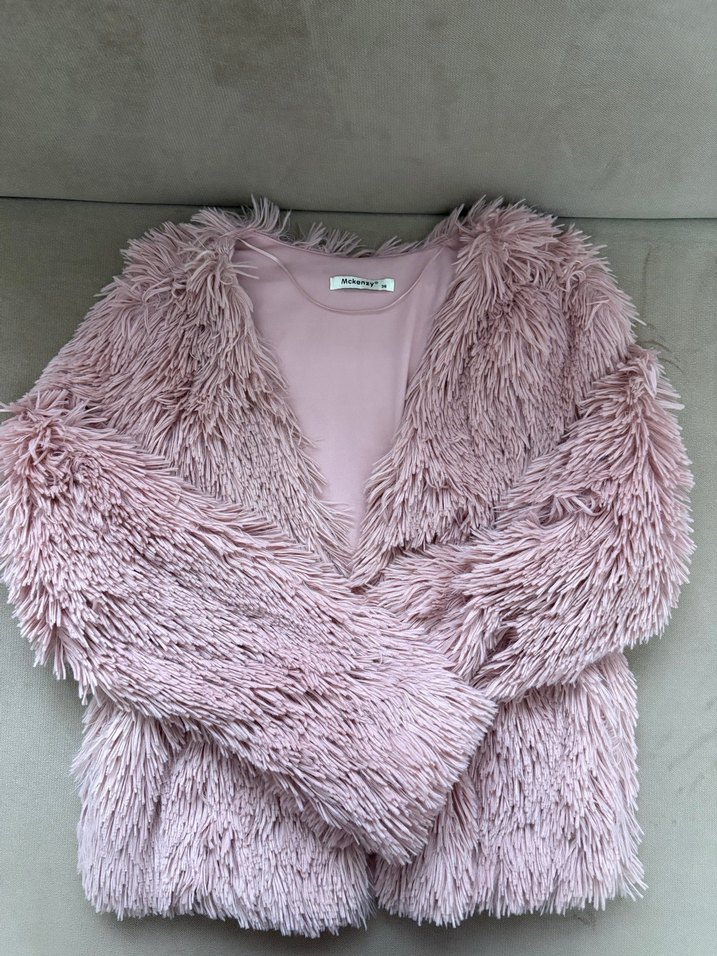 Pembe pastel tonlarda, uzun kollu, suni kürk detaylı, midi boy kadın ceketi. Yumuşak sentetik kumaştan, bohem tarzda günlük kullanım için uygun.