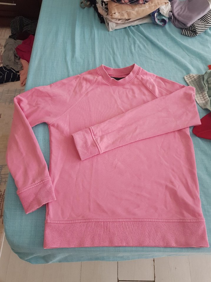 Pastel pembe renkte, bisiklet yaka ve uzun kollu rahat kesim sweatshirt. Yumuşak ve sıcak kumaştan üretilmiş, günlük kullanıma uygun sade ve konforlu tarz.parmaklarimin olduğu yerde iğne ucu kadar beyaz iki nokta var o yüzden makul ürün
