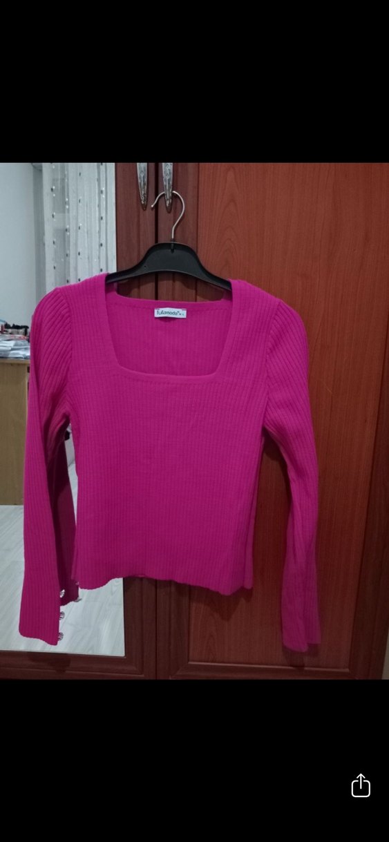 Uzun kollu, kare yaka ve pembe renkli triko kazak, minimalist ve normcore tarzıyla günlük kullanım için uygun. Hiç giymedimpembe kare yaka bluzdir kollarinda taş detayları metaldir ve çok parlaktır taşları her bir kokunda 3er tane var çok seksi bı pembe tonu