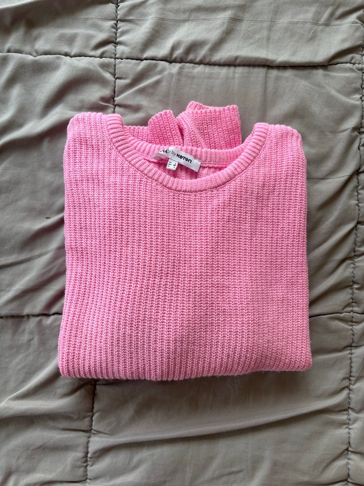 Pembe renkli, uzun kollu, yuvarlak yakalı triko kazak. Rahat kesimi ve normal boyu ile günlük kullanıma uygun, yumuşak ve sıcak bir dokusu var.