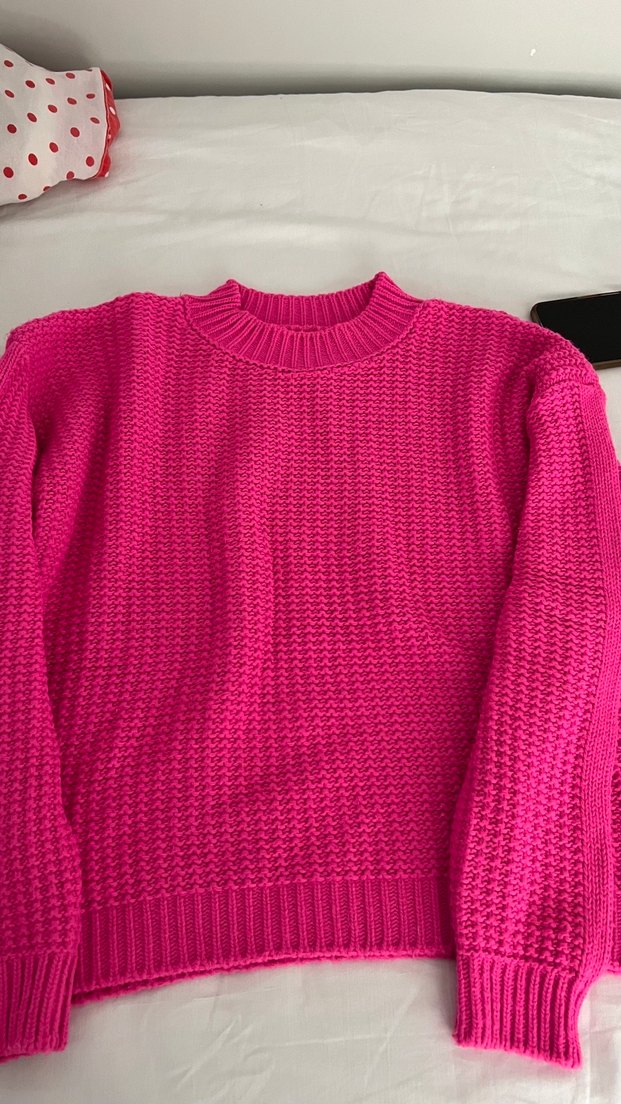 Pembe renkli, yuvarlak yaka ve uzun kollu, örme kumaştan yapılmış, rahat kesim ve normal boyda kadın kazak.