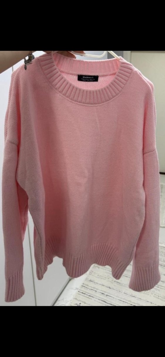 Pembe renkli, yuvarlak yakalı, uzun kollu, normal boyda ve bol kesim triko kazak. Yumuşak örgü kumaşı ve pastel tonu ile rahat ve gündelik bir tarz sunar.