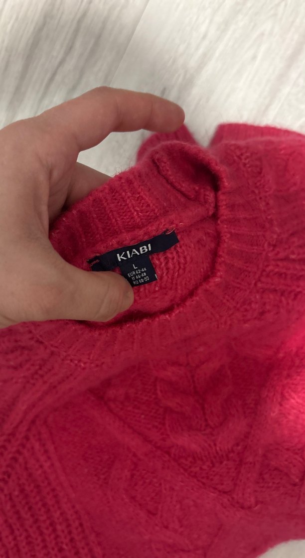 Pembe renkli, triko dokuma, bohem tarzında, yuvarlak yakalı, uzun kollu, vücuda oturan kadın kazak. KIABI markalı, rahat ve parlak dokulu.