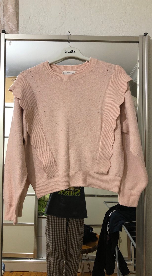 Pembe triko kumaştan, uzun kollu, fırfır detaylı ve normal boyda, salaş kesim kadın kazak. Yumuşak pastel rengiyle rahat bir görünüm sunar.