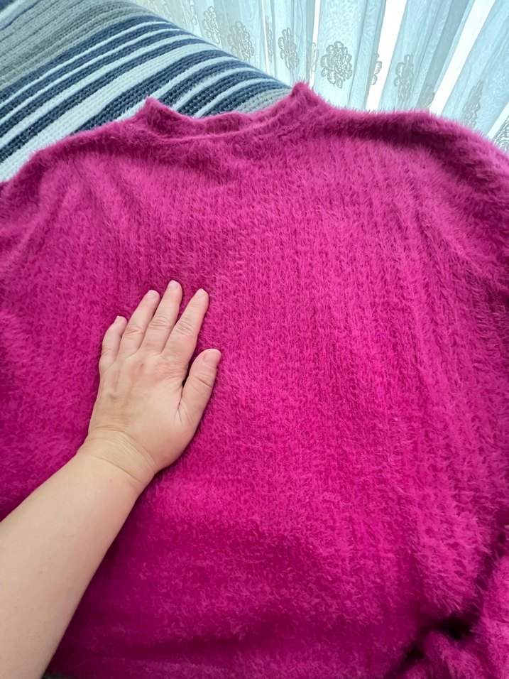 Pembe renkli, ve yumuşak dokulu triko kazak. Yuvarlak yaka, uzun kollu, bel boyda, günlük rahat kullanım için uygundur.