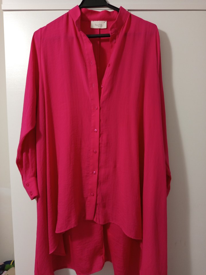 Pembe içi parlak renkli , düğmeli ve hakim yaka uzun kollu, bol kesim kadın gömleği. Uzun boyu ve sade tasarımı ile çağdaş bir stil sunar. asimetrik kesime sahip