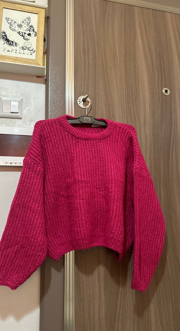 Pembe renkli, uzun kollu, yuvarlak yakalı örgü kazak, salaş kesimiyle günlük rahatlık sağlar. Desensiz ve renkli tasarımıyla konforludur.