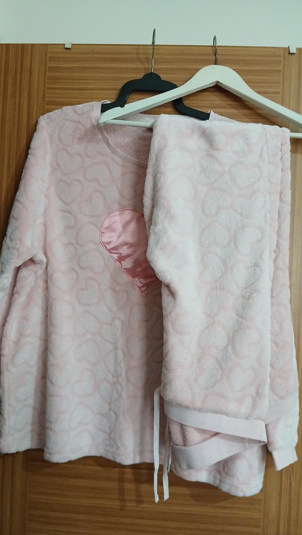 Yumuşak ve rahat kumaştan, uzun kollu ve midi boy pembe pijama takımı. Üzerinde ince kalp desenleri ve parlak kalp detayı bulunur.
