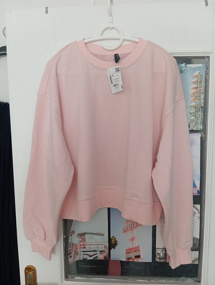 Pastel pembe renkte, uzun kollu ve bisiklet yakalı bol kesim sweatshirt. Yumuşak ve sıcak kumaştan, günlük rahat sokak stili için uygun.