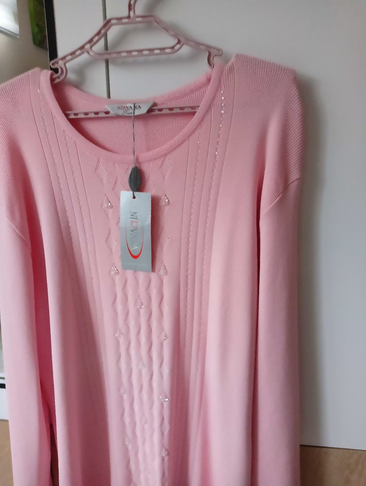 Pembe renkte, yuvarlak yaka ve uzun kollu, rahat kesime sahip kadın triko kazak. Yumuşak dokulu, pastel tonlarda, günlük kullanıma uygun sade bir modeldir.