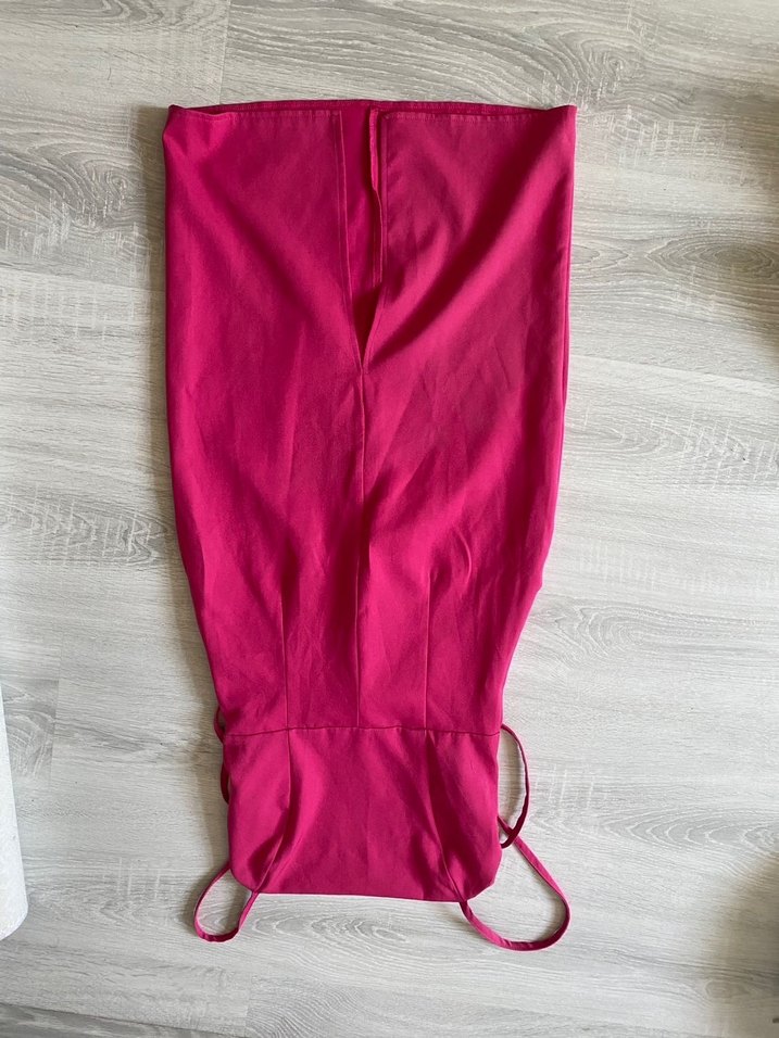Parlak pembe sentetik kumaştan, v yaka ve ince askılı, , dar kesim kadın elbise arkada yırtmacı mevcut . Minimalist sokak stili ile uyumlu, romantik buluşmalar için uygun. Sorunsuz ve temiz