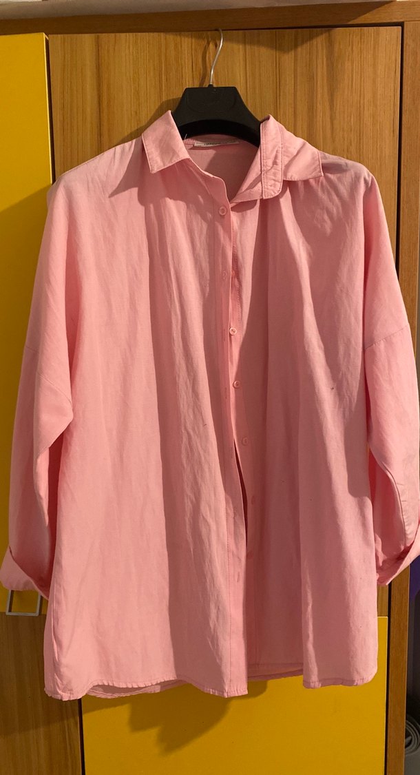 Pastel pembe renkte, düğmeli ve uzun kollu, normal boy midi uzunluğunda, salaş kesim kadın gömleği. Minik lekesi var o yüzden uygun tuttum