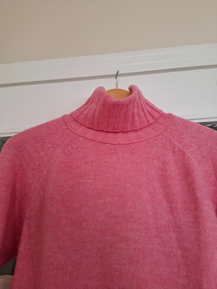 Pembe yün, boğazlı, örgü dokulu, bol kesim rahat ve normcore tarzda günlük kullanıma uygun kadın kazağıdır.