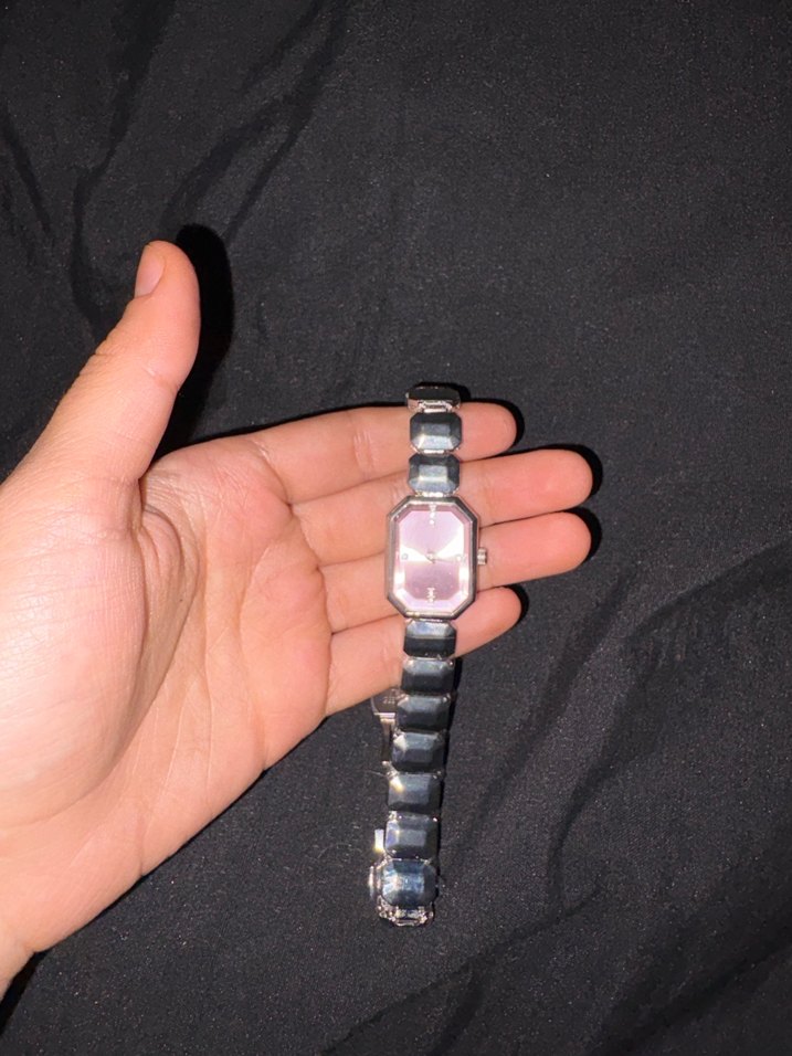 Pembe kadranlı, tokalı gri metal kayışa sahip kadın kol saati, minimalist ve gotik tarzı bir araya getirir. ⌚