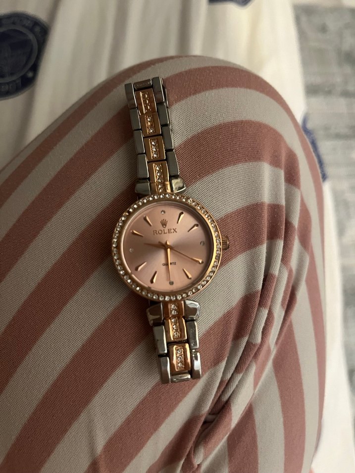 Pembe kadranlı, gri ve altın renkli tokalı metal kayışa sahip kadın saati. Trendy casual ve streetwear tarzında, Paris esintili. ⌚