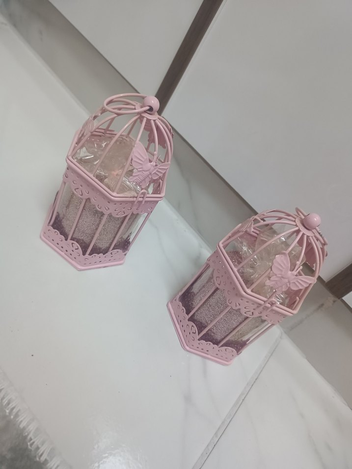 Pembe pastel renkte, kelebek detaylı kafes tasarım metal mumluklar. Dekoratif bir dokunuş sağlar. ️
