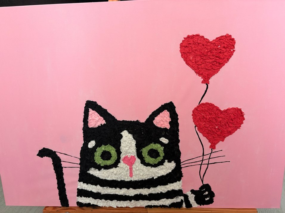 Renkli pembe zemin üzerinde kalp balonları tutan yumuşak dokulu kedi tablosu, boyutlu ve dokulu. 35X50 cm tuval uzerine