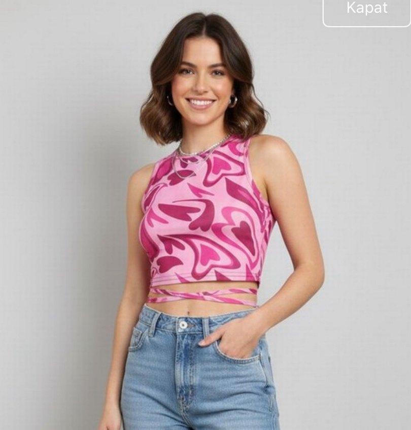 Pembe renkli, kalp desenli, bağcıklı detaylı, denim kumaştan yapılmış, kısa ve dar kesim crop top. Günlük sokak stili için uygun.