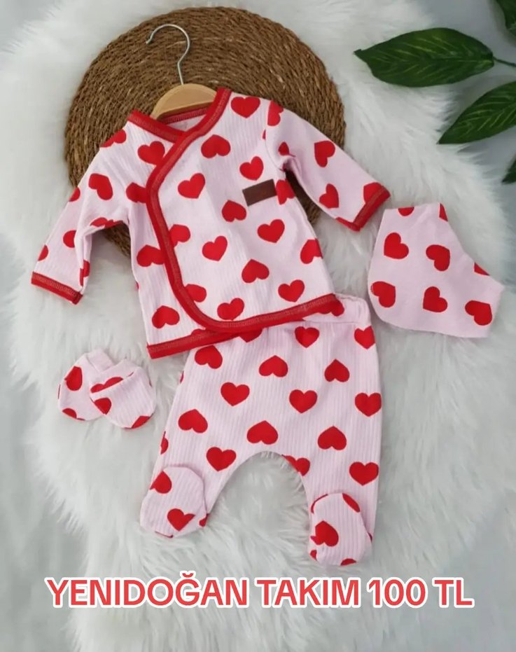 Kırmızı kalp desenli, dantel detaylı pembe bebek hastane takımı. Üst, pantolon, şapka ve eldiven içerir. Yumuşak ve rahat kumaş.