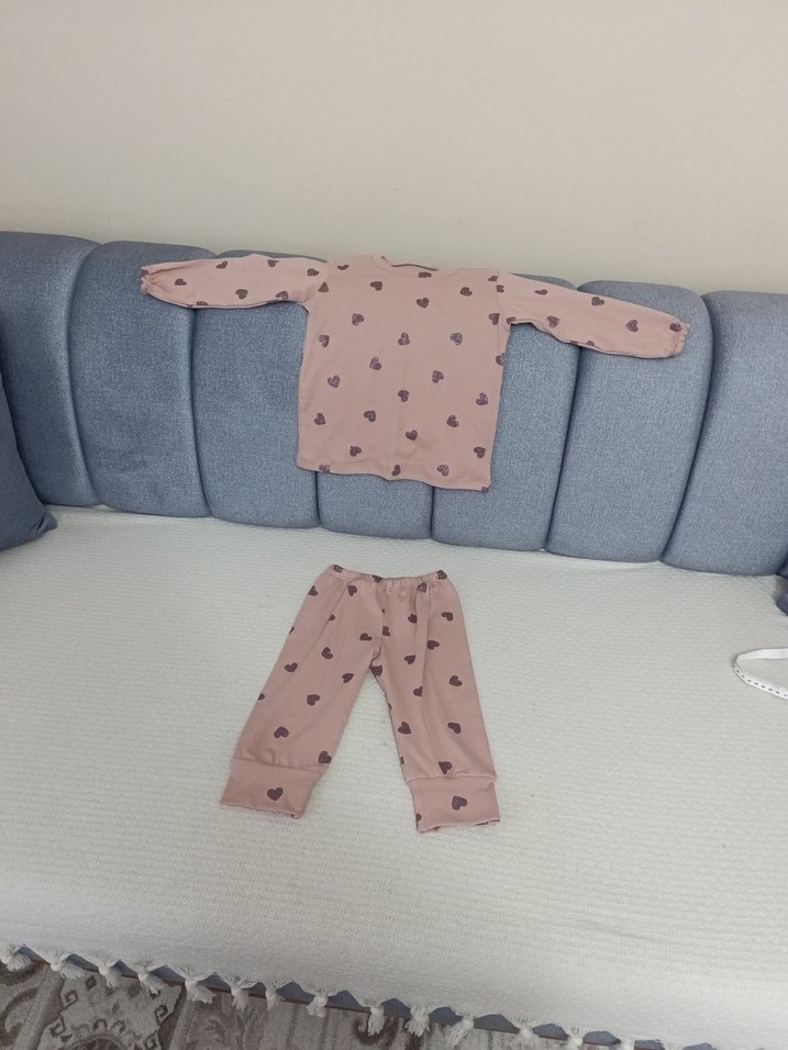 Pastel pembe renkte, kalp desenli bebek kız takımı. Uzun kollu ve düğmeli tasarıma sahiptir.