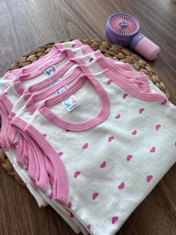 Kolsuz, pastel pembe kalp desenli Çıtçıtlı bebek body. Pamuklu ve rahat kumaş.