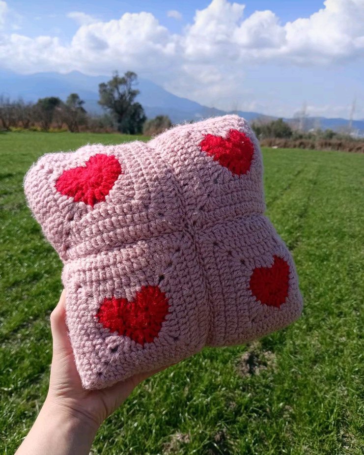Pastel pembe renkte, her yüzünde kırmızı kalp desenleri bulunan el örgüsü yumuşak ve rahat bir yastık. ❤️