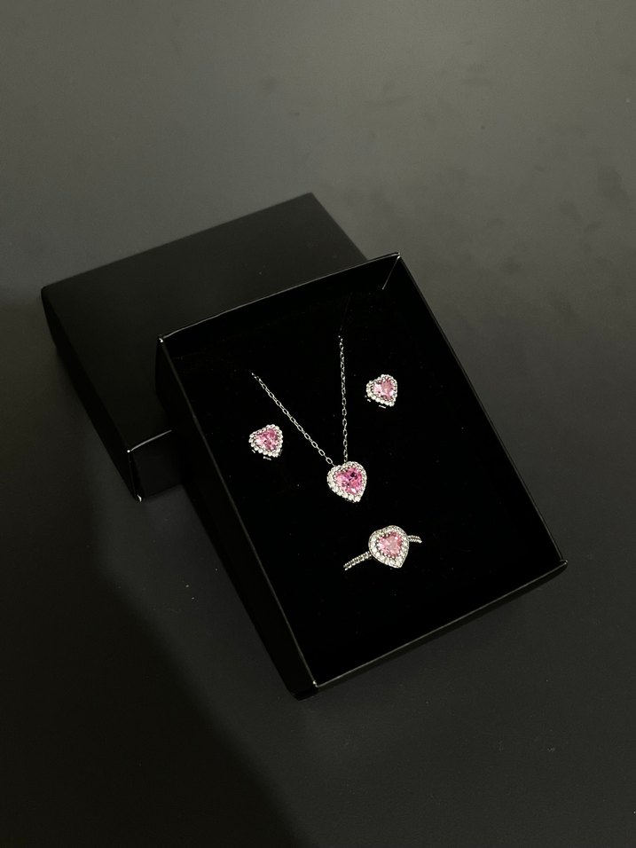 Pembe Kalp Desenli Kadın Gümüş Takı Seti
