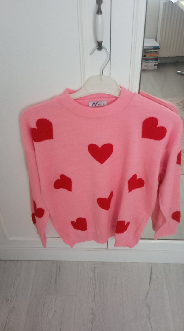Pembe renkli, kalp desenli, uzun kollu, yuvarlak yaka, bol kesim kısa triko kazak. Rahat ve şık sokak stili için uygundur.