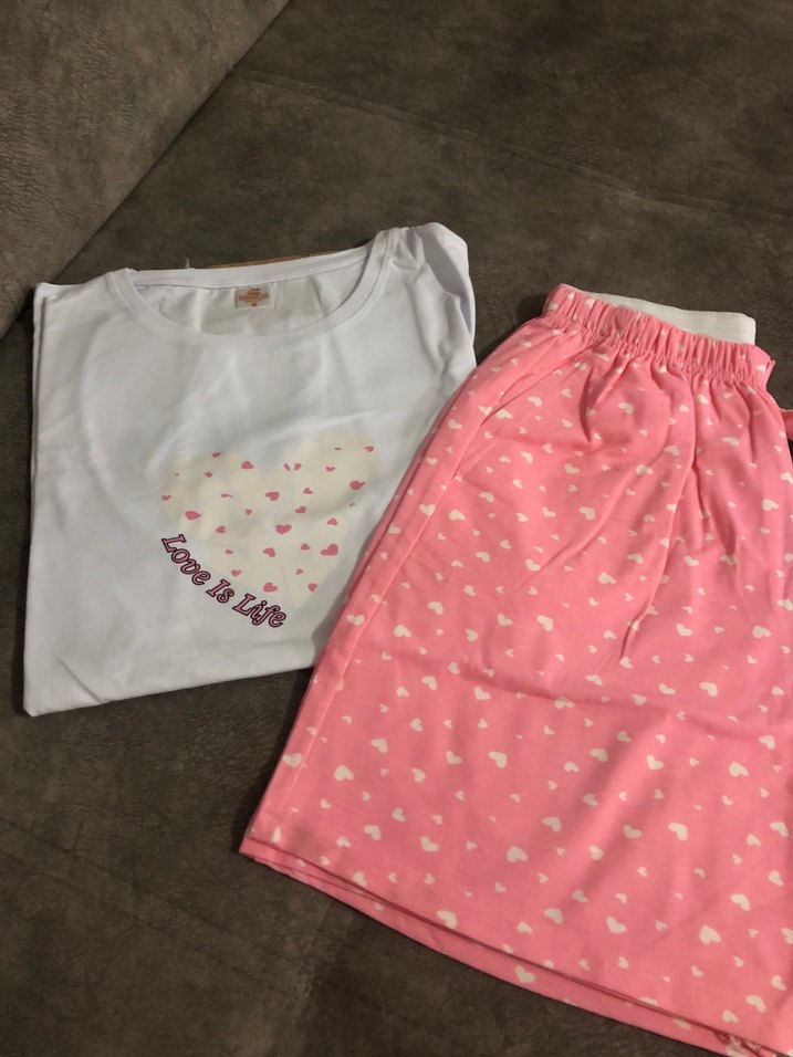 Kadınlar için bol kesim, beyaz kısa kollu üst ve pembe kalp desenli mini şorttan oluşan pijama takımı. Üstte "Love is Life" yazılı kalp baskısı bulunur. Rahat ve pastel tonludur. Rahat kalıptır. Pamuklu kumaştır
