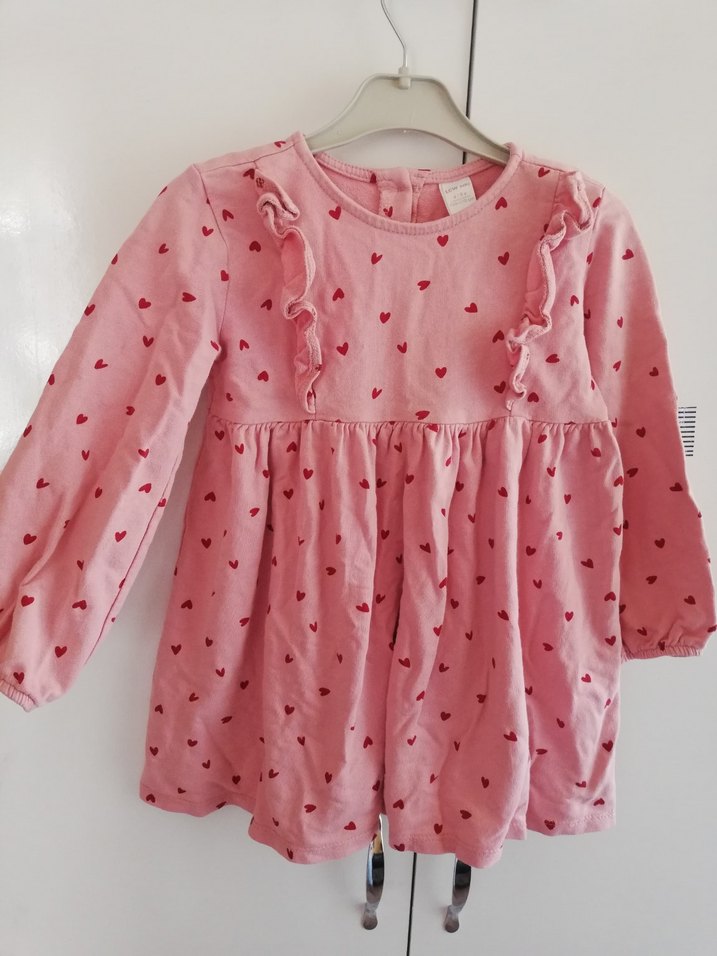 Pembe renkte, uzun kollu ve yuvarlak yakalı kız çocuk elbisesi. Yumuşak ve sıcak kumaştan, kalp desenli ve fırfır detaylı, rahat kesim.