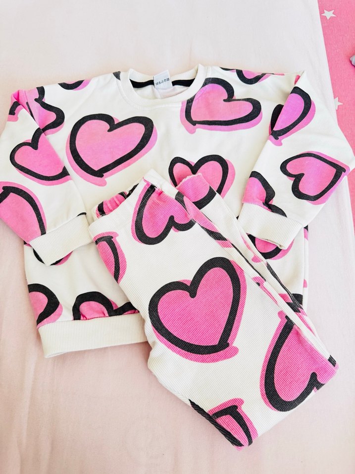 Uzun kollu, renkli pembe kalp desenli kız çocuk takımı. Rahat ve şık bir seçim.