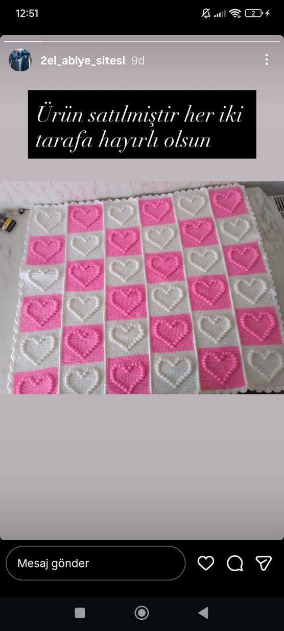 Pembe ve beyaz karelerden oluşan örgü battaniye, kalp desenleri ve "tarafa hayurli olsun" yazısı ile yumuşak ve sıcak bir üründür.