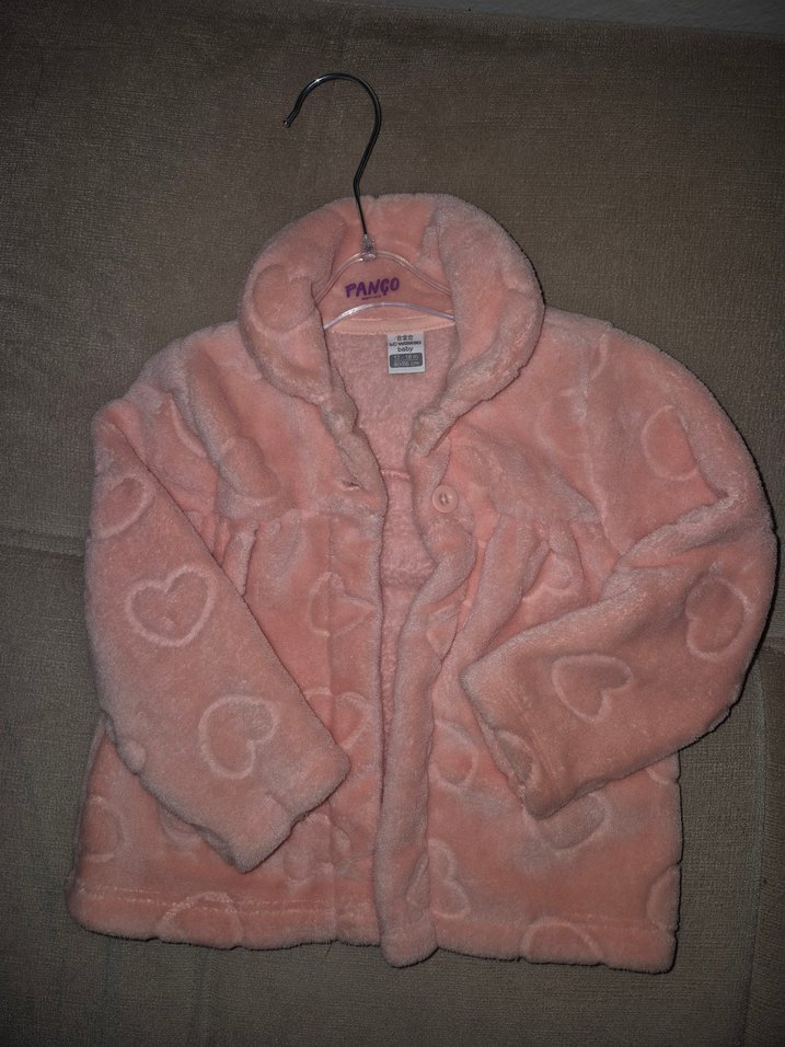 Yumuşak peluş kumaştan, kalp desenli, pembe renkli bol kesim kız mont. Notlu yaka ve düğmeli kapanış özelliği vardır.