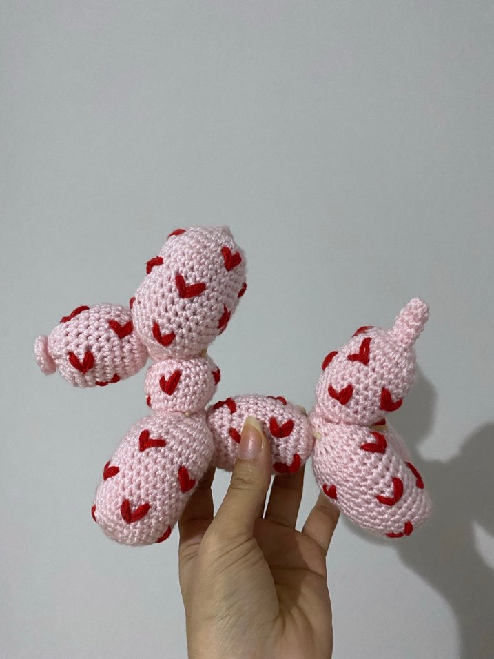 Kırmızı kalp desenleriyle süslenmiş renkli pembe balon köpek oyuncak, yumuşak ve tamamen el örgüsü.