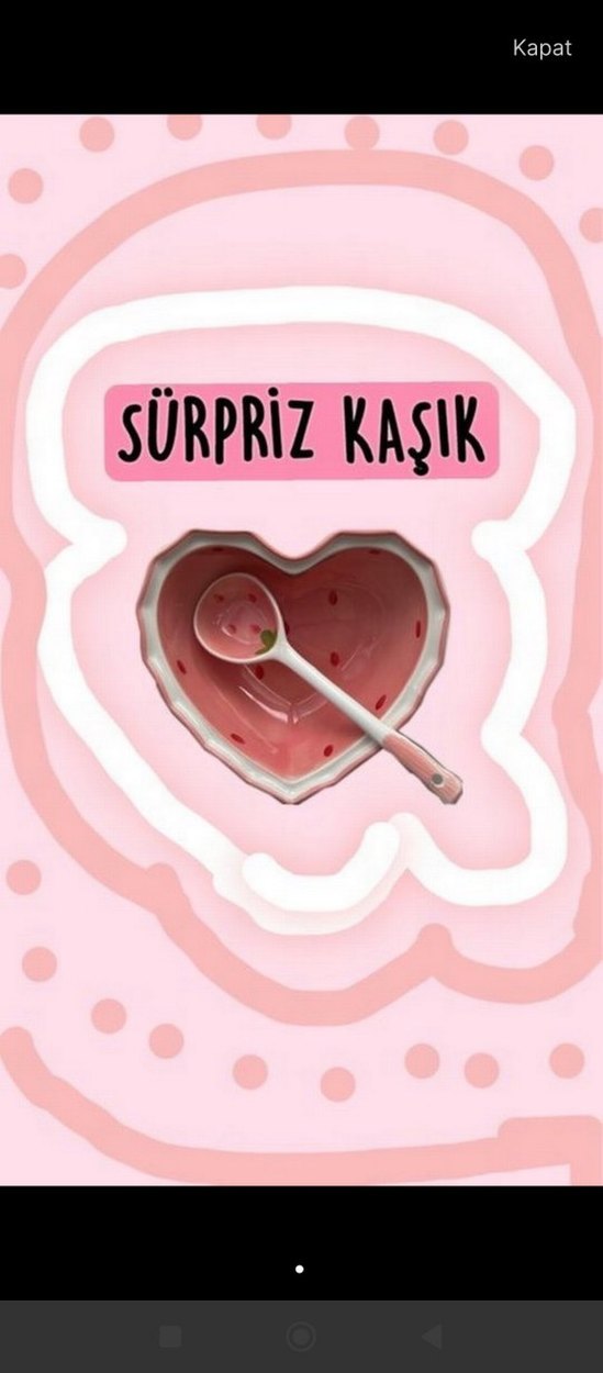 Pastel pembe kalp şeklinde tabak ve üzerinde "SÜRPRİZ KAŞIK" yazılı baskılı kaşık içeren eğlenceli bir set.