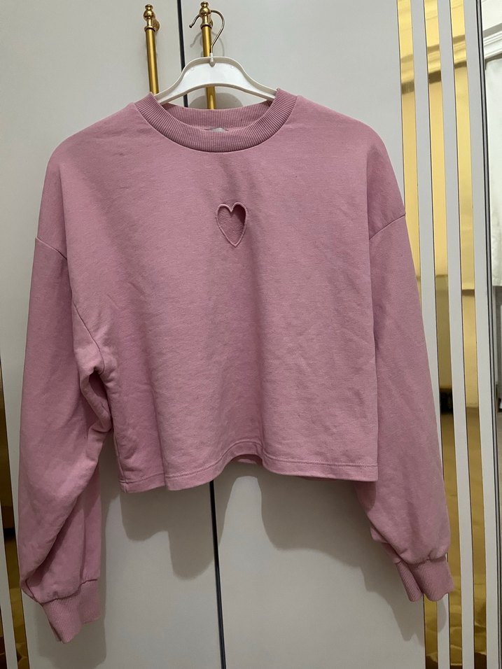 Pastel pembe renkte, uzun kollu, yuvarlak yaka ve bol kesim kadın sweatshirt. Göğüs kısmında küçük kalp kesim detayı bulunur. Rahat ve şık bir tasarım.