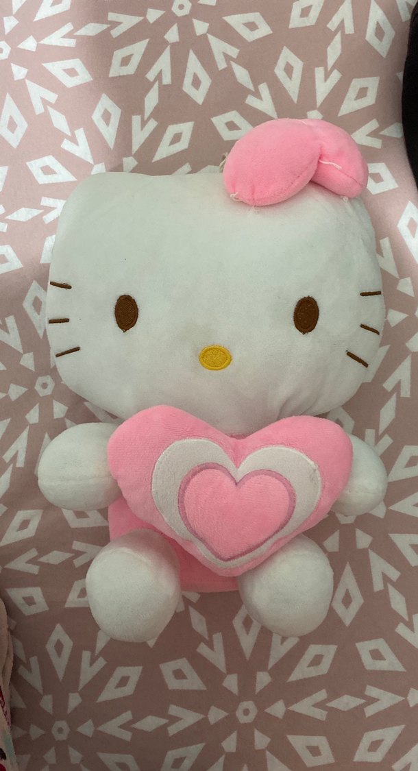 Yumuşak pastel pembe ve beyaz peluş oyuncak, kalp detayı, sevimli yüz ve fiyonk ile. Rahatlık için ideal. Hello kitty
