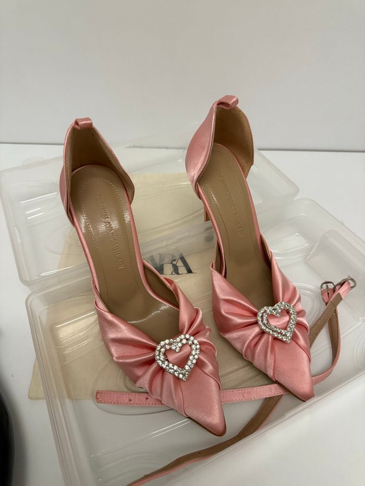 Pembe sentetik kumaştan yapılmış, fiyonk ve taşlı kalp detaylı topuklu abiye ayakkabılar, düğün ve özel günler için uygundur.