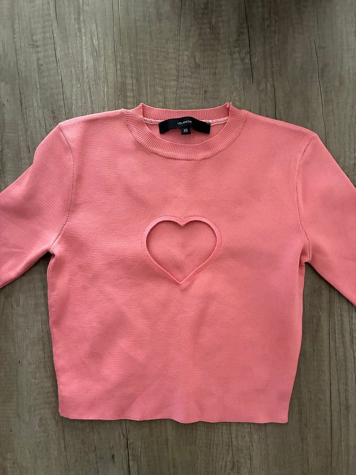 Pembe triko, uzun kollu, bisiklet yaka ve kalp şeklinde kesim detayı bulunan, rahat ve şık sokak stili kadın kazak. Günlük kullanıma uygundur.