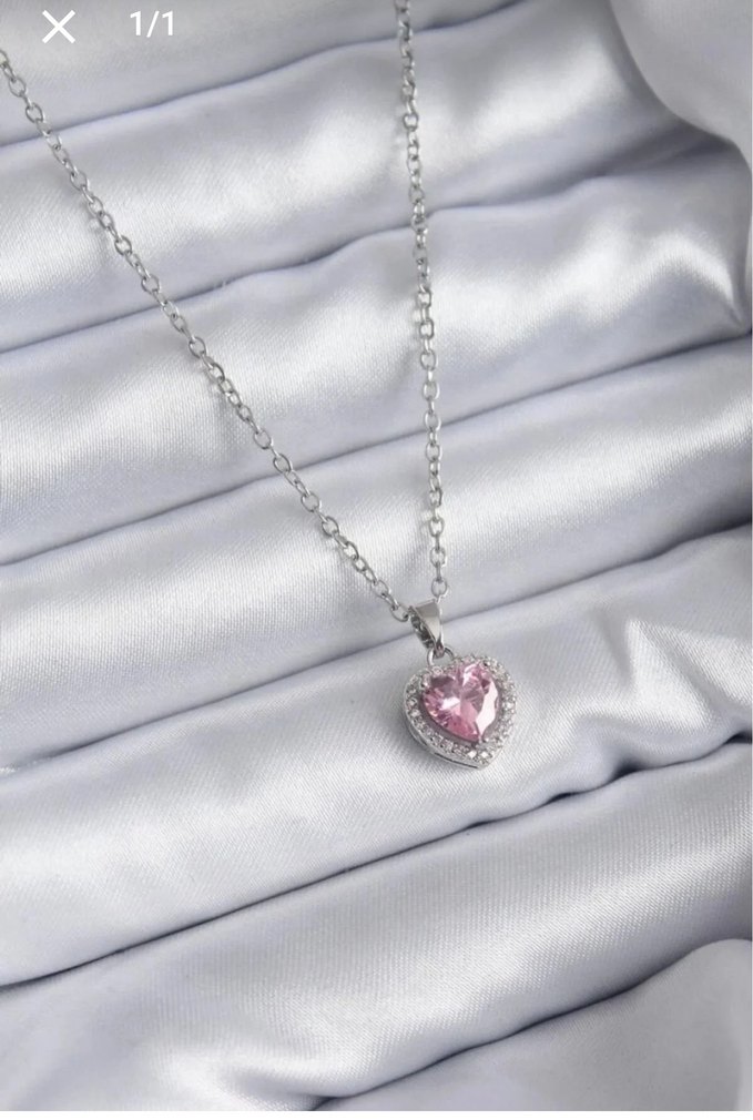 Pastel pembe kalp şeklinde taşlı kolye, zarif zincir detayıyla romantik akşamlar için uygundur.