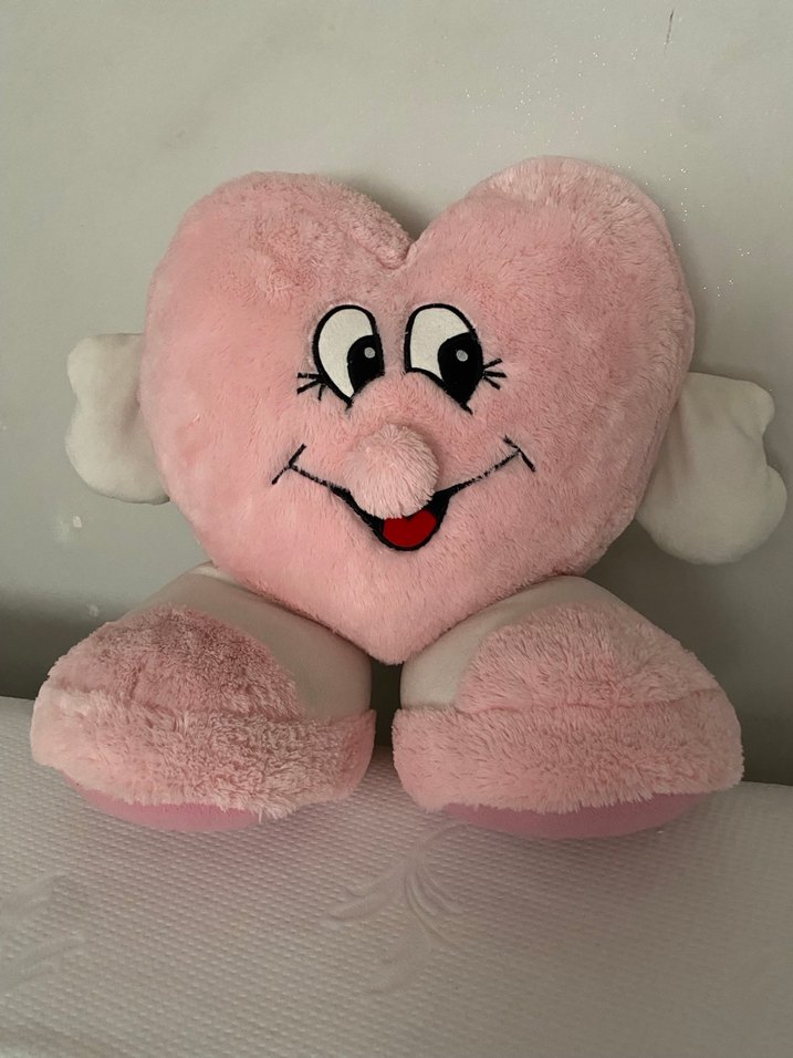Yumuşak kumaştan yapılmış, gülen yüz özellikleri ve küçük kollar ile ayaklara sahip pastel pembe kalp şeklinde peluş oyuncak. 60 cm bana hediye geldi ama ben böyle şeyleri sevmiyorum ama yumuşacık yırtık vs.değil
