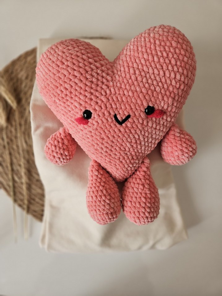 Yumuşak ve pastel pembe renkte, sevimli yüz ve kolları olan kalp figürlü peluş oyuncak.