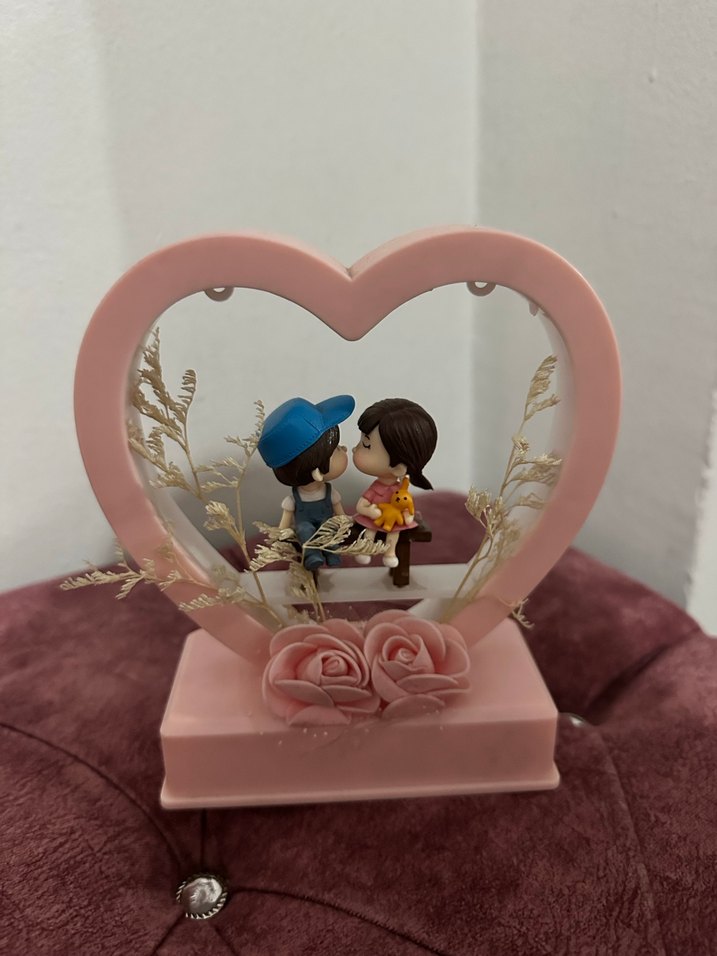Pembe kalp şeklinde figür, içinde çiftin oturduğu, kurutulmuş çiçeklerle çevrili ve tabanda iki gül süsü bulunan romantik ışıklı biblo.