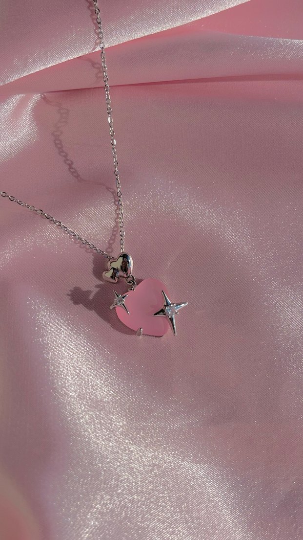 Pastel pembe tonlarında, gümüş yıldız detaylı,çelik kolyemiz