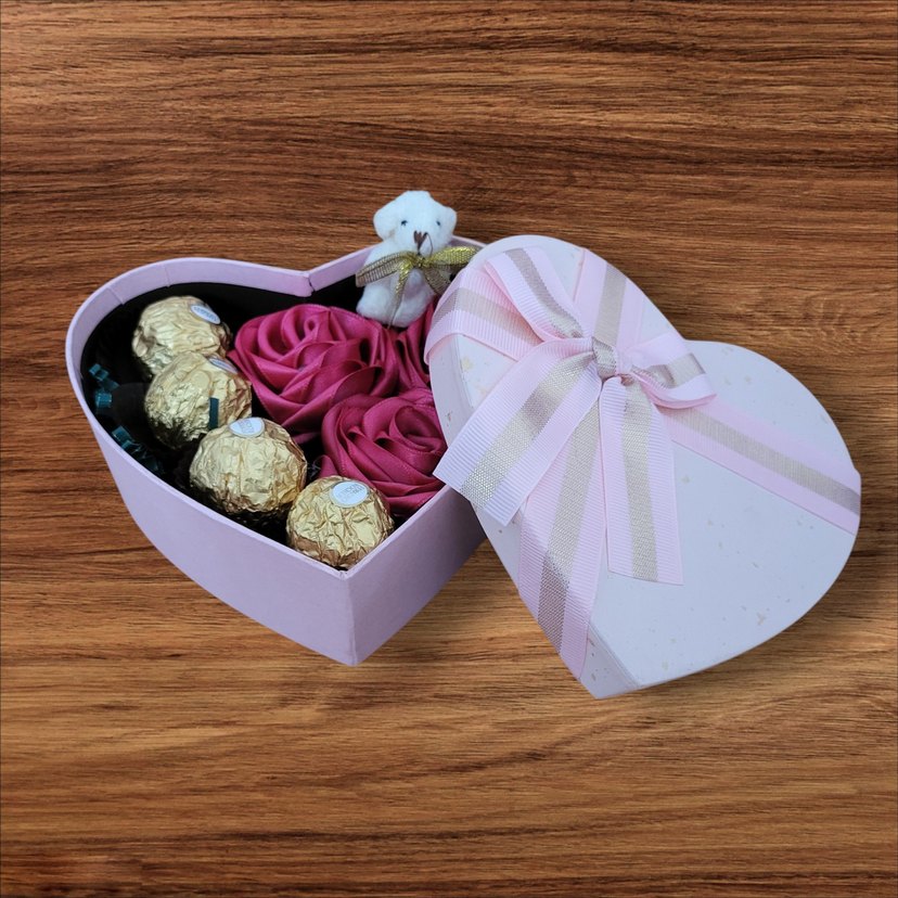 Pastel pembe kalp şeklinde kutuda sarılı çikolatalar, yapay güller ve küçük bir oyuncak ayı bulunur.
