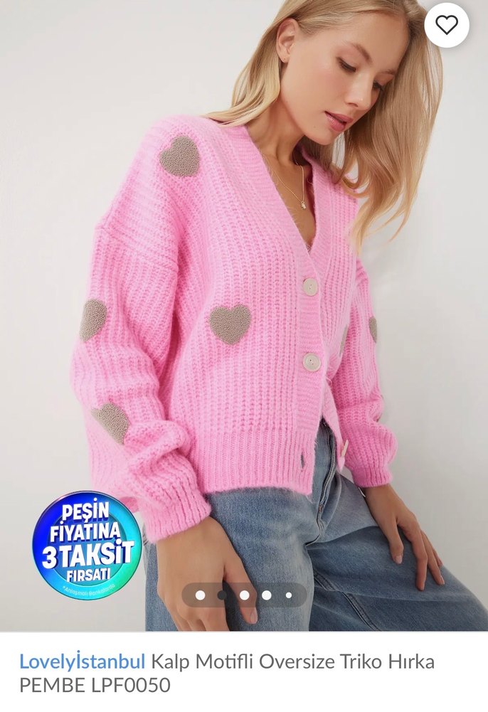 Kalp desenli, pembe renkte, oversize kesim, uzun kollu, V yakalı kısa triko hırka. Rahat ve günlük kullanım için uygun.