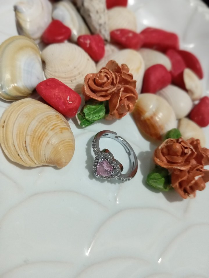 Pembe kalp taşlı, küçük parlak taşlarla çevrili gümüş renkli kadın yüzüğü. Renkli, payetli ve çiçek desenli, bohem ve retro tarzda bir tasarım.