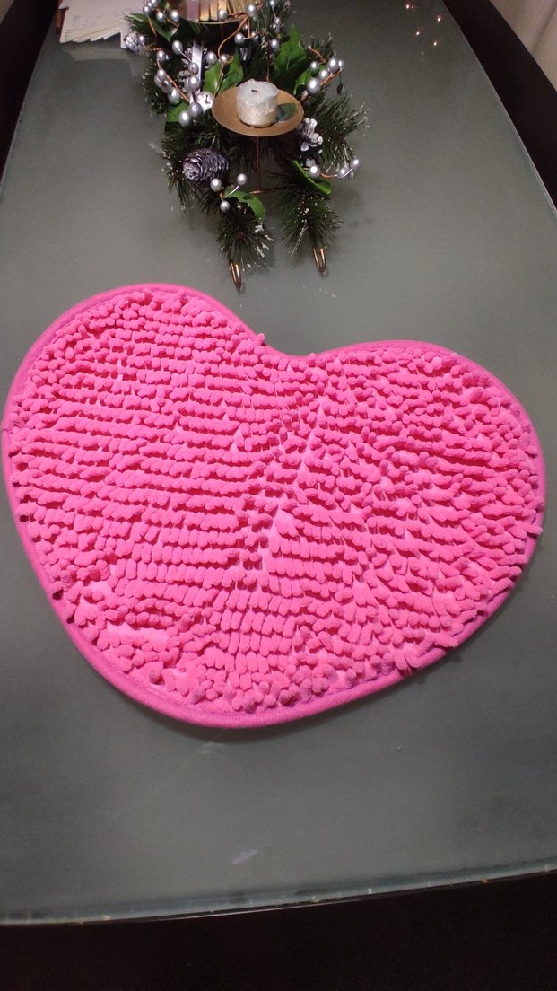 Yumuşak dokulu, pembe kalp şeklinde banyo paspası. Canlı ve dikkat çekici tasarıma sahip. yeni hiç kullanilmamıştır. 35*50 cm dir.